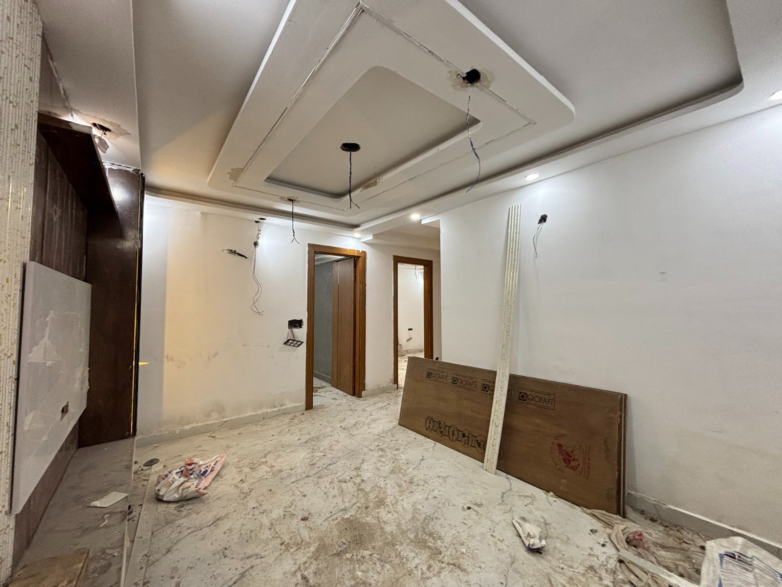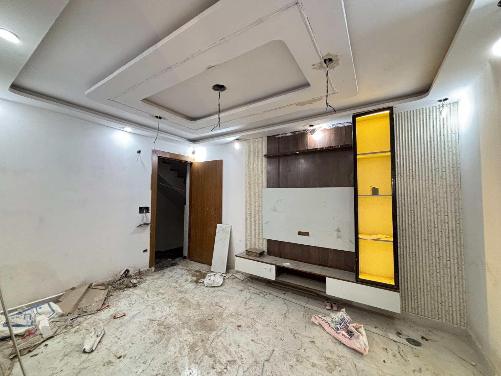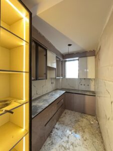 Semi-furnished with modular kitchen, chimney, false ceiling, wallpaper, fans, tubelights & jhumar
